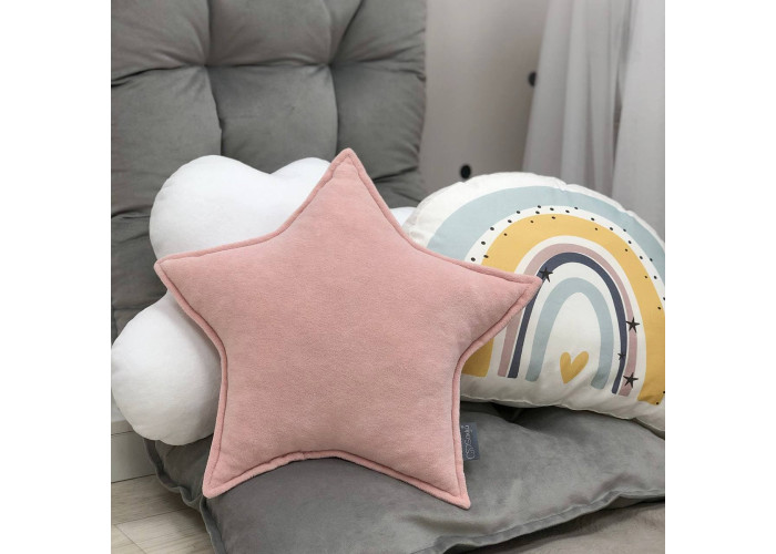 Красива та оригінальна подушечка у формі зірки для дитячого ліжечка. Догляд: рекомендується хімчистка, або ручне прання при температурі 30 - 35 градусів, щоб уникнути деформації тканини, акуратно прополіскувати, дбайливо віджимати, не викручуючи руками. Засіб для прання не повинен бути агресивним, бажано рідким, без додавання відбілюючих засобів та хлору. Відбілювачі можуть зруйнувати волокна ніжного велюру, або зробити їх крихкими. Невеликі забруднення можна обережно видаляти за допомогою розведених миючих засобів, нанесених на губку. Сушити краще далеко від прямих сонячних променів та приладів опалення в розправленому вигляді на рушник, але не розтягувати. Воді, що залишилася, потрібно дати можливість стекти. Велюр зазвичай не меніться, тому прасування не потрібно.