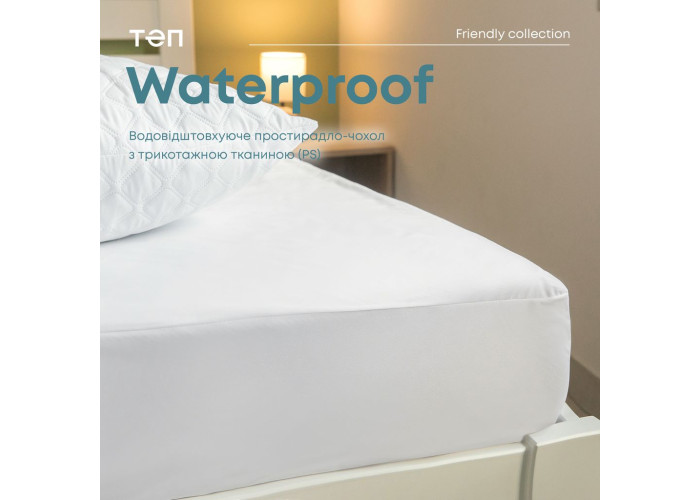 Вологонепроникне простирадло-чохол ТЕП "WATERPROOF" (Р.S.) призначене для гігієни спального місця, збереження зовнішнього вигляду матраца і для захисту від рідких забруднювачів. Має "дихаючі" та вологовідштовхувальні властивості. Верхнє покриття наматрасника - гіпоалергенна та приємна на дотик трикотажна тканина. Простирадло-чохол фіксується на матраці за допомогою еластичному подолу на гумці (висота подолу - 30см). Таке кріплення додатково захищає від забруднень бокову частину матрацу та дозволяє швидко одягати й знімати виріб за потреби.