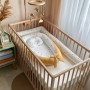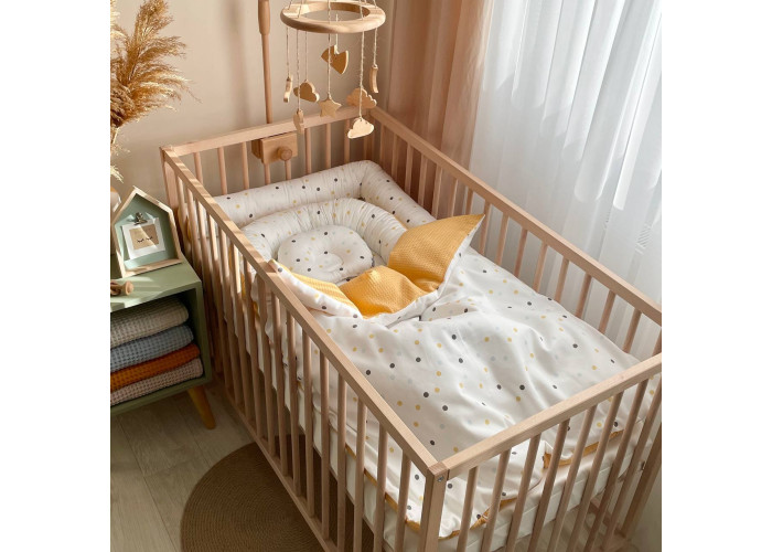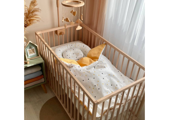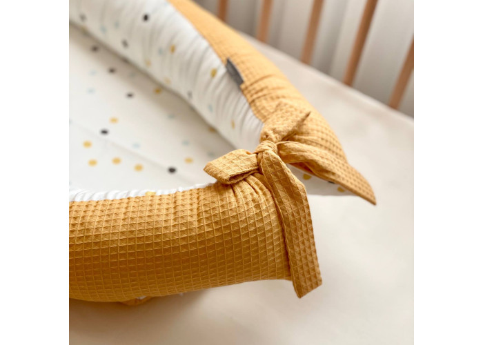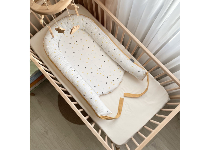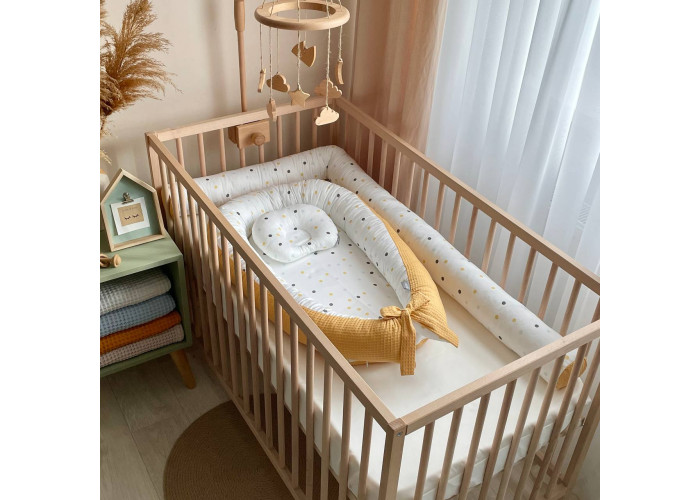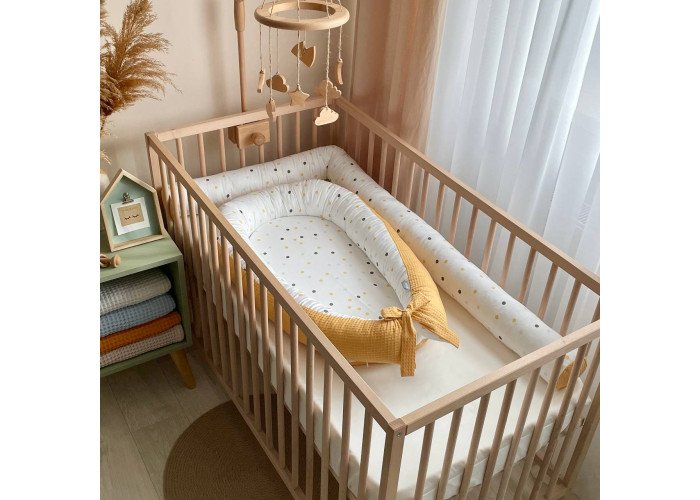 Гніздечко-кокон-це невеликий, ергономічний, плоский матрац з м'якими обмежувальними бортиками по всьому периметру заввишки 10 см. Наповнювач матраца - піна, пружний, сучасний, модифікований матеріал, який рівномірно розподіляє навантаження, завдяки чому малюк почуває себе затишно і комфортно. Чохол матраца пошитий з мікрофібри. Наповнювач для бортиків - силіконізоване волокно. Бортики можна стягнути спеціальною ниткою, яка вже вшита в кокон і зафіксувати бантом, таким чином можна зменшувати, або збільшувати розмір кокона-гніздечка. Тканина чохла - натуральна 100% бавовна сатин.