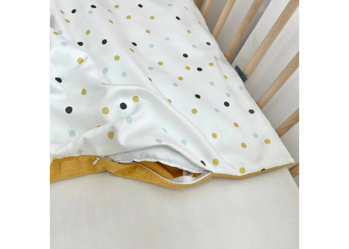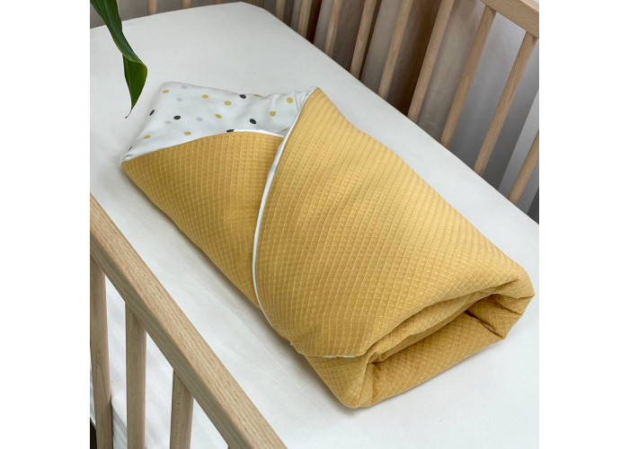Дитячий двосторонній плед-конверт з ковдрою. Бантик не входить у комплектацію. Плед з однієї сторони виготовлений із сатину, з іншої - із вафельної тканини, всередені ковдра. Наповнювач ковдри - лебединий пух.