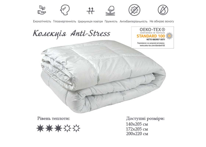 Силіконова ковдра «Anti-stress» ТМ Руно- основною особливістю виробів з цієї колекції є можливість зняття і розсіювання статичної напруги людського тіла в процесі сну завдяки спеціальним карбоновим ниткам, які вплетені в верхню тканину ковдри. В результаті людина швидше і краще відновлюється, сон стає спокійним і комфортним. Ковдра є в різних розмірах. У комплект до ковдри рекомендуємо придбати подушку «Anti-stress». Ковдра 140х205 силіконова "Anti-stress" — це якісний текстиль для комфортного та здорового сну. Виріб виготовлений з , що забезпечує м’якість, зносостійкість та довгий термін служби. Наповнювач добре утримує тепло, пропускає повітря та підходить для щоденного використання. Розмір ідеально підходить для Ковдри. Продукція бренду Руно відповідає сучасним стандартам якості та безпеки. Ковдра 140х205 силіконова "Anti-stress" легко доглядати, підходить для дому, квартири або подарунка. Замовляйте Ковдра 140х205 силіконова "Anti-stress" в інтернет-магазині Green-Farm з доставкою по всій Україні, швидкий зв'язок у Вайбер +380661920048
