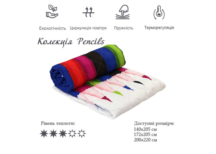 Вовняна ковдра "ШК_Pencils" ТМ Руно - це демісезонна ковдра, чохол виконаний з набивного сатину з яскравим дизайнерським малюнком кольорових олівців. В якості наповнювача використовується натуральна овеча вовна, що дозволяє підтримувати оптимальну температуру під час сну. Таку ковдру можна використовувати замість покривала, так як її барвистий малюнок не хочеться ховати в підковдру. Ковдра виготовляться в різних розмірах півтороспальному, двоспальний, та євро, також в комплект ми рекомендуємо придбати декоративні подушки з дизайном кольорових олівців. Ваша кімната заграє яскравими фарбами з ТМ Руно. Ковдра 140х205 вовняна "Pencils" — це якісний текстиль для комфортного та здорового сну. Виріб виготовлений з , що забезпечує м’якість, зносостійкість та довгий термін служби. Наповнювач добре утримує тепло, пропускає повітря та підходить для щоденного використання. Розмір ідеально підходить для Ковдри. Продукція бренду Руно відповідає сучасним стандартам якості та безпеки. Ковдра 140х205 вовняна "Pencils" легко доглядати, підходить для дому, квартири або подарунка. Замовляйте Ковдра 140х205 вовняна "Pencils" в інтернет-магазині Green-Farm з доставкою по всій Україні, швидкий зв'язок у Вайбер +380661920048