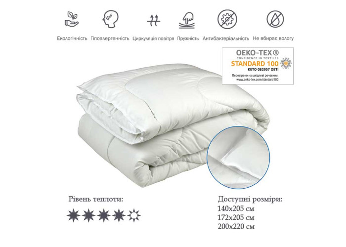 Наповнювач силікон: виготовляється з силіконізованого поліефірного волокна. Даний наповнювач найбільш практичний і зручний у використанні. Не викликає алергічних реакцій, не вбирає вологу і запахи. Ковдра з таким наповнювачем легка та дуже приємна на дотик. Вироби з таким наповнювачем чудово тримають форму, яка не змінюється в процесі тривалого використання і неодноразового прання. Ковдра 200х220 силіконова біла — це якісний текстиль для комфортного та здорового сну. Виріб виготовлений з , що забезпечує м’якість, зносостійкість та довгий термін служби. Наповнювач добре утримує тепло, пропускає повітря та підходить для щоденного використання. Розмір ідеально підходить для Ковдри. Продукція бренду Руно відповідає сучасним стандартам якості та безпеки. Ковдра 200х220 силіконова біла легко доглядати, підходить для дому, квартири або подарунка. Замовляйте Ковдра 200х220 силіконова біла в інтернет-магазині Green-Farm з доставкою по всій Україні, швидкий зв'язок у Вайбер +380661920048