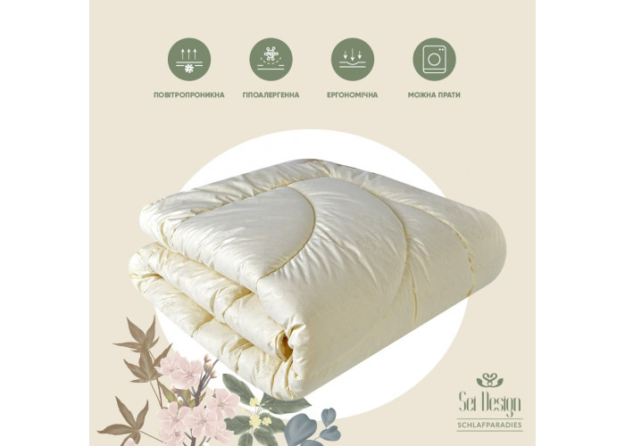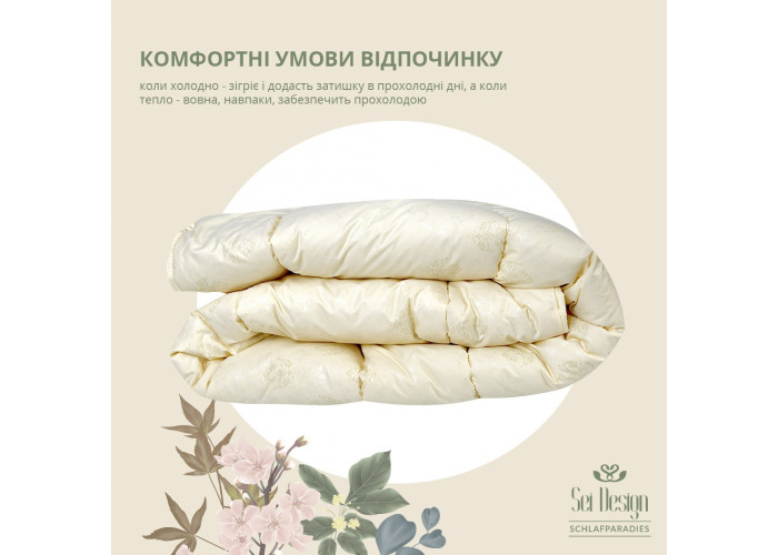 Sei Design Cashmere Premium відрізняється якісним виконанням. Ковдра приємна на вигляд та на дотик. Її чохол пошито з гарної тканини ніжного молочного кольору. Виріб має унікальний принт на тканині. При його виготовленні використовується наскрізна художня стібка. Колекція передбачає наявність стандартних розмірів.