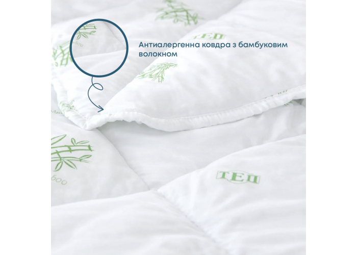 7 причин полюбити цю ковдру:1. Не викликає алергії - тому користуватися можуть усі;2. Наповнювач з натуральним бамбуковим волокном для комфортного і міцного сну;3. Бамбукове волокно забезпечує відчуття свіжості вночі та є ідеальним для літа;4. Наповнювач рівномірно розподілений по всій ковдрі та не збивається - достатньо легко потрусити ковдру для відновлення об'єму;5. М'яка ковдра повторює форму тіла і чудово зігріває;6. Простота у догляді: можна прати в пральній машині та сушити в сушильній машині;7. Виготовляється в Україні з турботою про здоровий сон і дотриманням європейських стандартів якості.