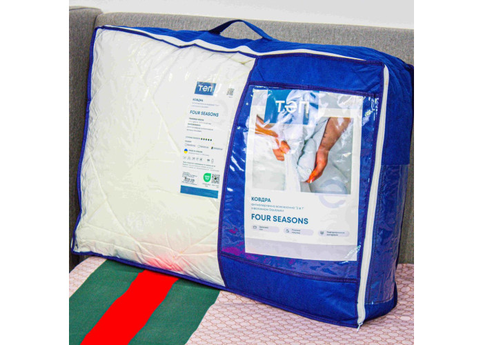 Функціональна ковдра 2-в-1 "Four Season" - прекрасний вибір на цілий рік. "Four Seasons" складається з двох повноцінних ковдр, які кріпляться між собою за допомогою кнопок. Перша більш об'ємна і тепла, друга - тонша. При потребі їх можна використовувати окремо одну від одної. Зовнішня тканина - біла мікрофібра, що добре пропускає повітря і відводить вологу.