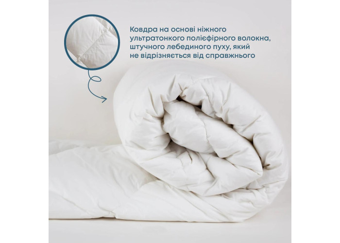 7 причин полюбити цю ковдру: не викликає алергії - тому користуватися можуть усі, натуральна тканина забезпечує відчуття свіжості вночі, дуже тепла ковдра - чудовий вибір для холодного сезону, наповнювач рівномірно розподілений по всій ковдрі та не збивається - достатньо легко потрусити ковдру для відновлення об'єму, м'яка ковдра повторює форму тіла і чудово зігріває, простота у догляді: можна прати в пральній машині та сушити в сушильній машині, виготовляється в Україні з турботою про здоровий сон і дотриманням європейських стандартів якості. Зручна м'яка ковдра на основі ніжного ультратонкого полієфірного волокна, штучного лебединого пуху, який не відрізняється від справжнього. Наповнювач ковдри екологічно чистий, не викликає алергії, добре пропускає повітря. Цупкий чохол з бавовняної тканини тік приємний на дотик, не пропускає дрібних волокон назовні. Завдяки технології рівномірного розподілу наповнювача та фігурній вистебці, наповнювач не збивається, а ковдра довго служить. Ковдра проста в догляді: її можна прати в пральній машині, вона швидко сохне і відновлює об'єм після прання. Ми дбаємо про ваше здоров'я, адже його запорука - міцний і достатній сон. Зовнішня тканина: батист Наповнення чохла: 100% ультратонке поліефірне волокно, ідентичне натуральному пуху Щільність наповнювача: 400 г/м²