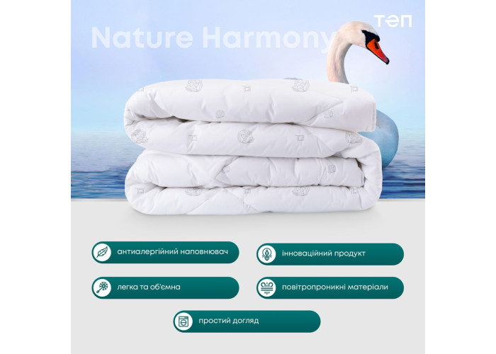 Зовнішня тканина – високотехнологічна мікрофібра Membrana. З внутрішнього боку ця тканина оброблена ультразвуковим коландером, що створює ефект мембрани. Особливість мембрани – пропускати всередину виробу трохи більше повітря, ніж випускати назовні. Так виникає повітряний ефект, який робить ковдри та подушки більш об'ємними, легкими, ніжними. Membrana – це тканина нового покоління, оксамитова, еластична, ніжна і дуже міцна. Натуральне бавовняне волокно м’яке та ніжне, це улюблений традиційний наповнювач в домашньому текстилі. Ковдри з колекції Nature від ТЕП – це сила природного відновлення для здорового комфортного сну.