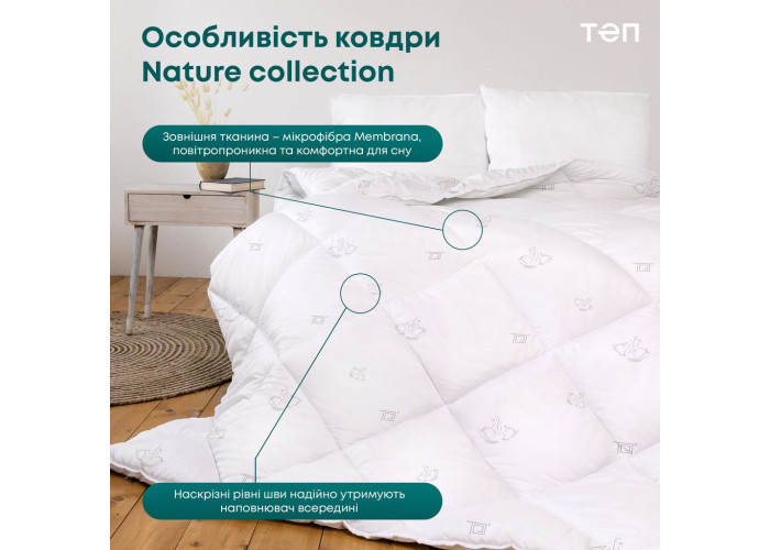 Зовнішня тканина – високотехнологічна мікрофібра Membrana. З внутрішнього боку ця тканина оброблена ультразвуковим коландером, що створює ефект мембрани. Особливість мембрани – пропускати всередину виробу трохи більше повітря, ніж випускати назовні. Так виникає повітряний ефект, який робить ковдри та подушки більш об'ємними, легкими, ніжними. Membrana – це тканина нового покоління, оксамитова, еластична, ніжна і дуже міцна. Натуральне бавовняне волокно м’яке та ніжне, це улюблений традиційний наповнювач в домашньому текстилі. Ковдри з колекції Nature від ТЕП – це сила природного відновлення для здорового комфортного сну.