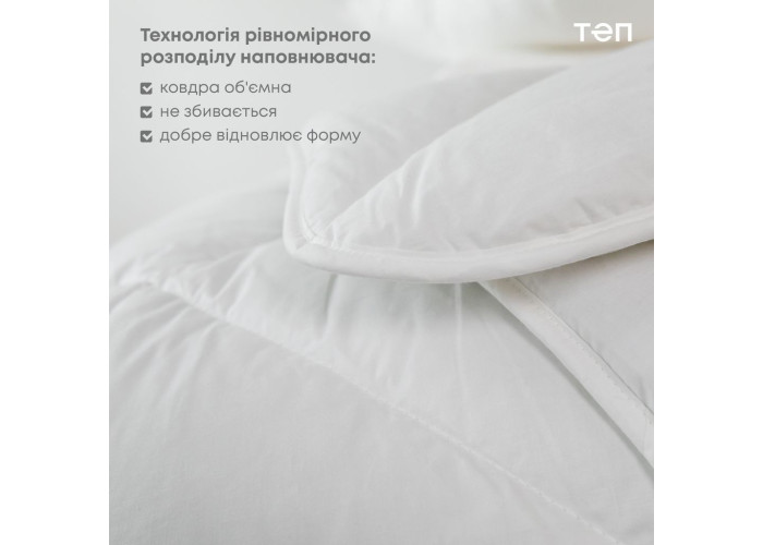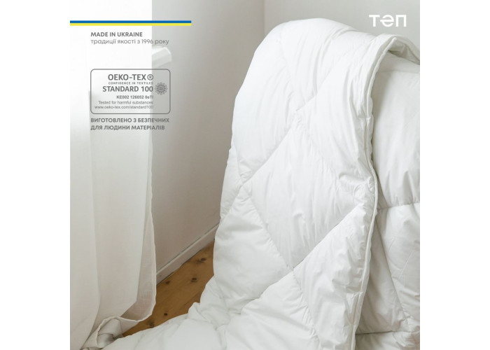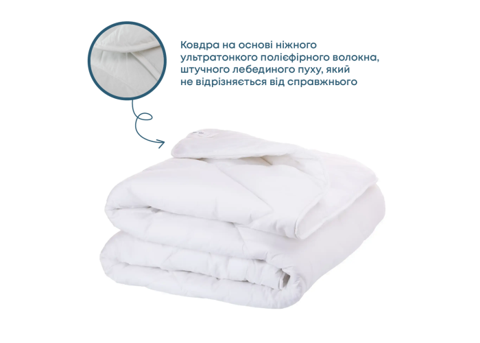 7 причин полюбити цю ковдру:1. не викликає алергії - тому користуватися можуть усі,2. ніжний м'який наповнювач для комфортного і міцного сну,3. "дихаюча тканина" забезпечує відчуття свіжості вночі,4. наповнювач рівномірно розподілений по всій ковдрі та не збивається - достатньо легко потрусити ковдру для відновлення об'єму,5. м'яка ковдра повторює форму тіла і чудово зігріває,6. простота у догляді: можна прати в пральній машині та сушити в сушильній машині,7. виготовляється в Україні з турботою про здоровий сон і дотриманням європейських стандартів якості.