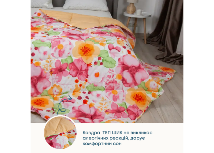 Ковдра ТЕП ШИК не викликає алергічних реакцій, дарує комфортний сон. Ковдра відмінно зберігає форму і забезпечує оптимальну циркуляцію повітря.