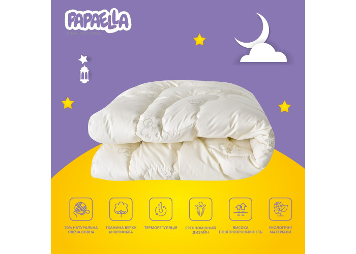 Супер тепла та легка ковдра з натуральною вовною - гарантовано здоровий сон та чудовий відпочинок. Зимова ковдра відмінної якості з унікальним принтом овечки на верхній тканині. Має приємний молочний колір, вона об’ємна, легка, пишна.