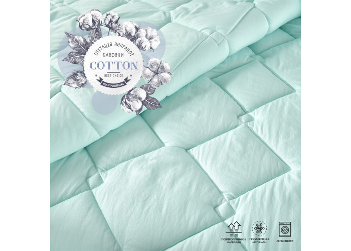 Ковдра всесезонна - не спекотна в теплу пору року, тепла в холодну. Структура тканини та наповнювача забезпечує ефективне видалення надлишків теплого і вологого повітря, зі збереженням температури, комфортної для сплячої людини. Силіконізоване полотно рівномірно розподіляється по всій площі та утримується на місці наскрізним декоративним вистебом.
