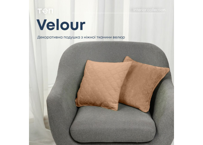 Розкішна м'яка подушка VELOUR від ТЕП. Подушки VELOUR від ТЕП доповнять інтер'єр вашої спальні і подарують відчуття затишку. Надзвичайно м’яка на дотик велюрова тканина виглядає розкішно в будь-якому інтер’єрі. Завдяки якісним матеріалам, подушки VELOUR зберігають естетичний вигляд впродовж довгого часу. Наповнювач в подушках VELOUR – силіконізоване поліефірне волокно. Воно не поглинає пил та бруд, не викликає алергічних реакцій, швидко сохне після прання.