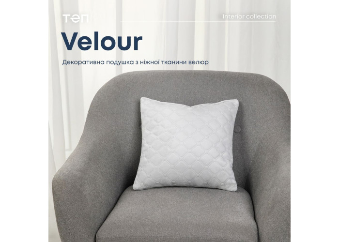 Розкішна м'яка подушка VELOUR від ТЕП. Подушки VELOUR від ТЕП доповнять інтер'єр вашої спальні і подарують відчуття затишку. Надзвичайно м’яка на дотик велюрова тканина виглядає розкішно в будь-якому інтер’єрі. Завдяки якісним матеріалам, подушки VELOUR зберігають естетичний вигляд впродовж довгого часу. Наповнювач в подушках VELOUR – силіконізоване поліефірне волокно. Воно не поглинає пил та бруд, не викликає алергічних реакцій, швидко сохне після прання.