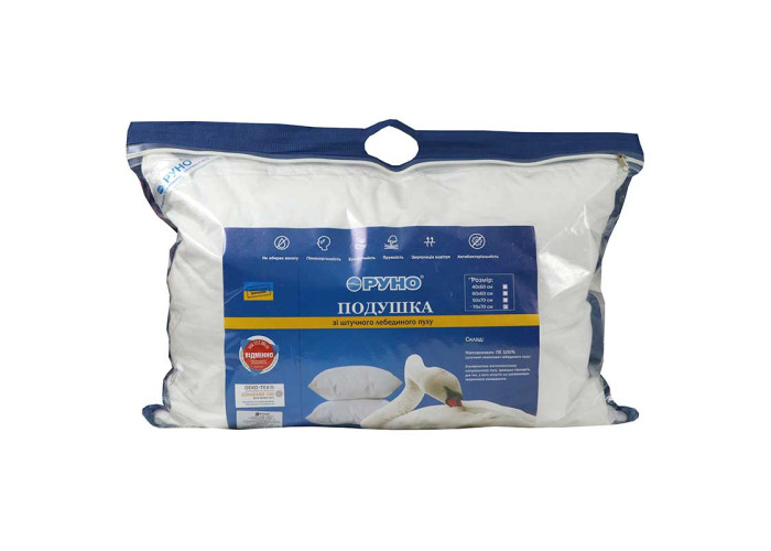 Штучний лебединий пух: сучасний інноваційний наповнювач, який виготовляється з дуже тонких мікроволокон і за своїм зовнішнім виглядом і характеристиками близький до натурального лебединому пуху. При цьому він має істотні переваги: не викликає алергічних реакцій, в ньому не заводяться кліщі та інші мікроорганізми. Подушки з таким наповнювачем можна прати, вони дуже легкі, ніжні і повітряні. Ще однією важливою перевагою є невисока вартість виробів з таким наповнювачем, доступна для кожної родини. Подушки з замінником лебединого пуху м'яко підтримують і розвантажують шию під час сну.