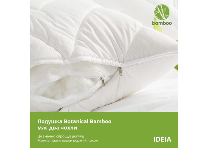 Подушка Botanical Bamboo має два чохли. Верхній - з ексклюзивним художнім вистебом і додатковим шаром наповнювача з бамбуком. Це значно спрощує догляд. Можна прати тільки верхній чохол. Конструктивно передбачено можливість відрегулювати висоту під себе. Обидва чохли мають застібку блискавку.
