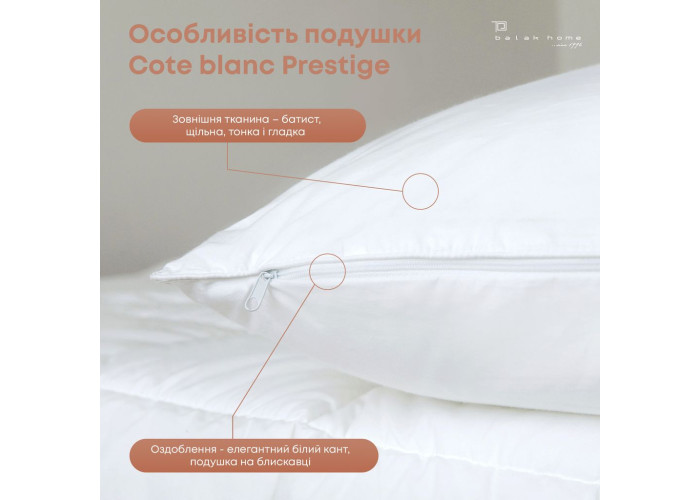 Подушка COTE BLANC PRESTIGE - це натуральна пружна, пишна і м'яка подушка, яка поєднує в собі тонкість і гладкість шовку, ніжність і комфорт бавовни. Наповнювач подушки - ультратонке поліефірне волокно, яке поєднує в собі теплозахисні та вентиляційні властивості, що не абсорбує сторонні запахи, перешкоджає розвитку пилового кліща, молі і цвілі, які викликають алергію, посилюють астму. Забезпечує вільну циркуляцію повітря. Підходить для людей з чутливою шкірою. Також подушка проста у використанні, витримує велику кількість прань і швидко сохне.