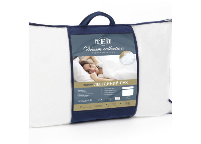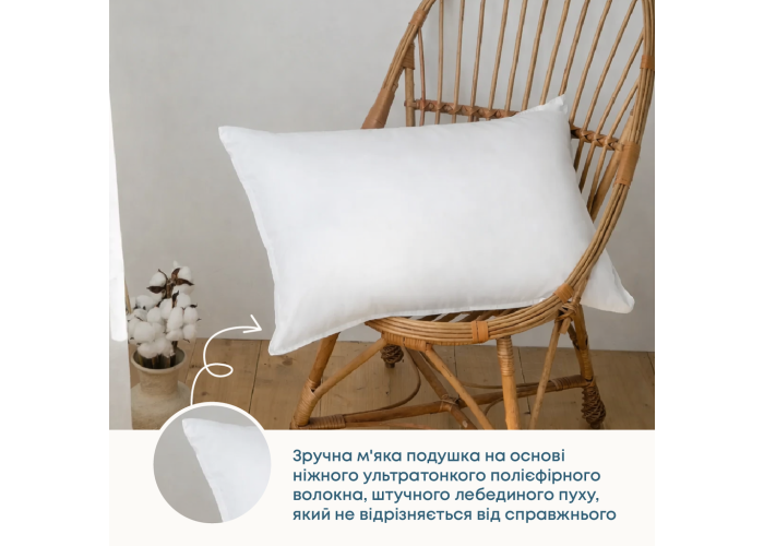 Зручна м'яка подушка на основі ніжного ультратонкого полієфірного волокна, штучного лебединого пуху, який не відрізняється від справжнього.