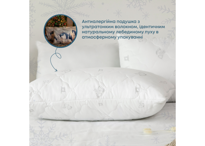 Вишукана антиалергенна стебнована подушка з волокном, ідентичним натуральному лебединому пуху у лімітованому атмосферному святковому упакуванні. Ідеально для подарунку собі чи близьким.