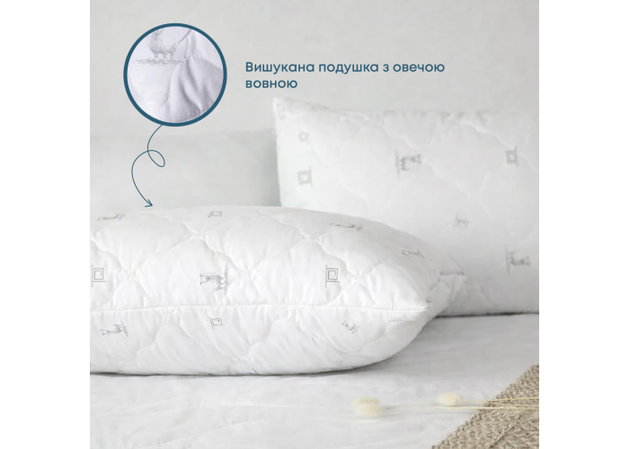 Натуральна овеча вовна пристебана до зйомного чохла, а всередині подушки – поліефірне силіконізоване волокно Double Air, антиалергійне, пружне, відмінно відновлює форму.