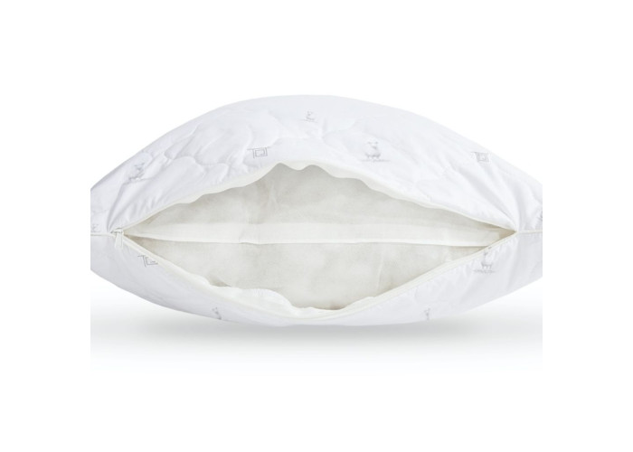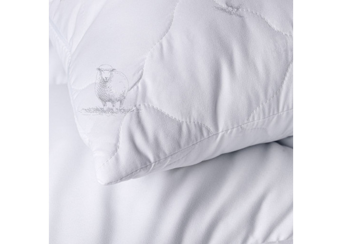 Натуральна овеча вовна пристебана до зйомного чохла, а всередині подушки – поліефірне силіконізоване волокно Double Air, антиалергійне, пружне, відмінно відновлює форму.