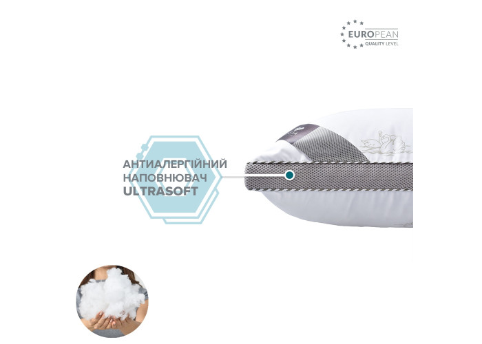 CLASSICA SOFT Лебеді має естетичний зовнішній вигляд і приємні тактильні властивості. Чохол подушки не зминається, не втрачає колір, пропускає повітря, відводить від сплячої людини зайве тепло і вологу. Ідеальне рішення і для зими, і для літа. Вставка-сітка у вигляді бортика, виготовлена з дихаючої тканини контрастного кольору, надає виробу форму, підвищує повітропроникність, формує особливий зовнішній вигляд. Обидві сторони подушки мають приємну, гладку, білосніжну поверхню і декоративний принт.