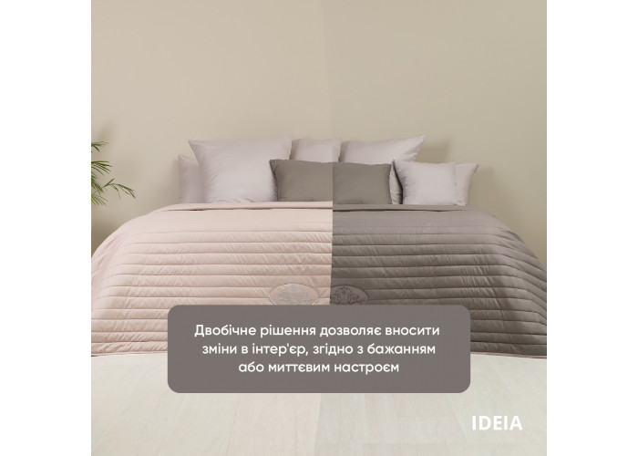 Покривала СТИЛЬ ROYAL - двосторонні, зі світлою і темною стороною. ТМ IDEIA пропонує колекцію оригінальних відтінків з грамотно підібраною палітрою. Над створенням палітри працювала досвідчені дизайнери. Вироби стійкі до факторів, що можуть викликати зміни кольору. Вони не вигоряють, не бліднуть, зберігають свою красу весь термін експлуатації. Двобічне рішення дозволяє вносити зміни в інтер`єр, згідно з бажанням або миттєвим настроєм. Обидві сторони покривала рівноцінні.
