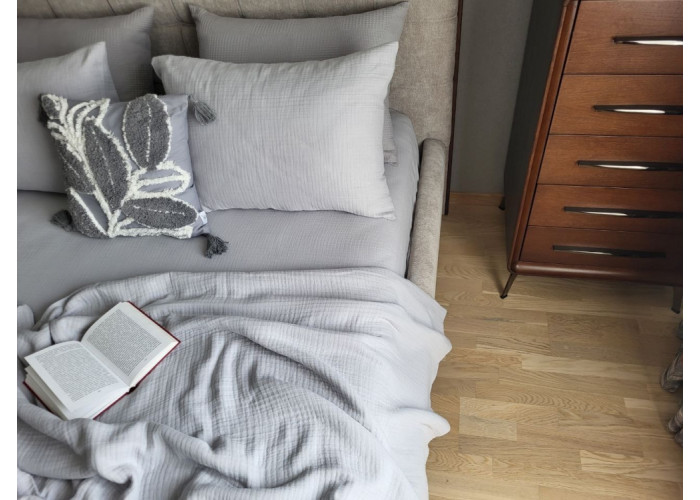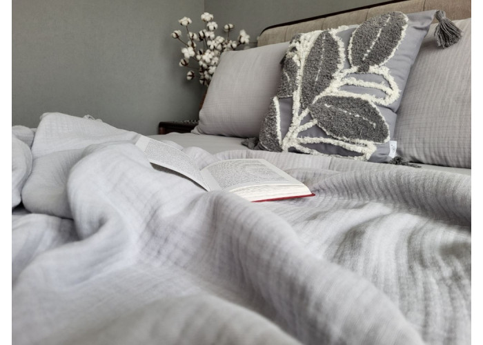- Високу повітропроникність та гігроскопічність тканини. Муслін чудово вбирає та відводить вологу. Тканина "дихає" практично як живий організм, даруючи власнику комфорт під час сну.