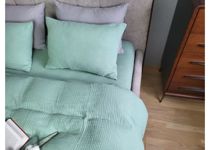 - Високу повітропроникність та гігроскопічність тканини. Муслін чудово вбирає та відводить вологу. Тканина "дихає" практично як живий організм, даруючи власнику комфорт під час сну.